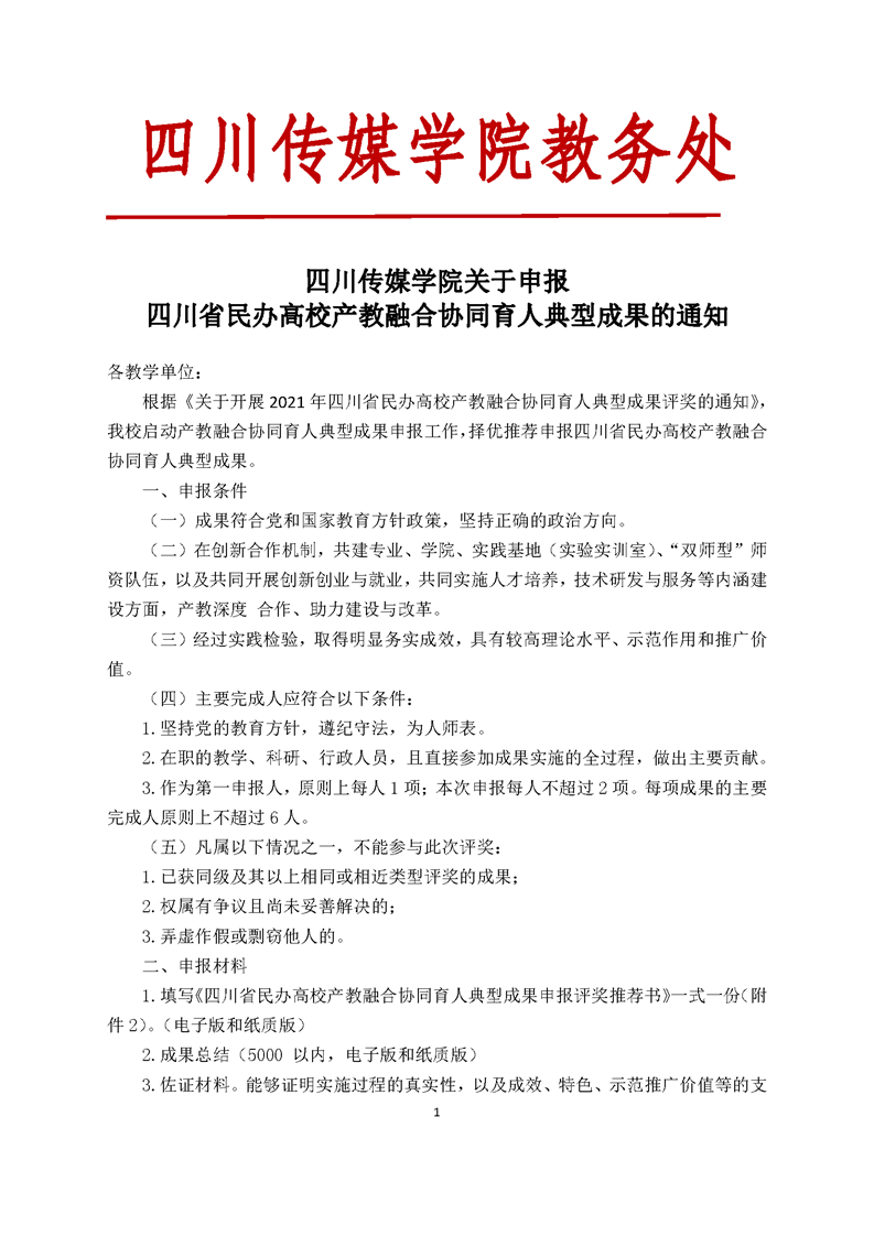 四川传媒学院关于申报四川省民办高校产教融合协同育人典型成果的通知