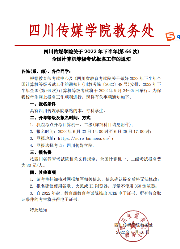 四川传媒学院关于2022年下半年(第66次)全国计算机等级考试报名工作的通知
