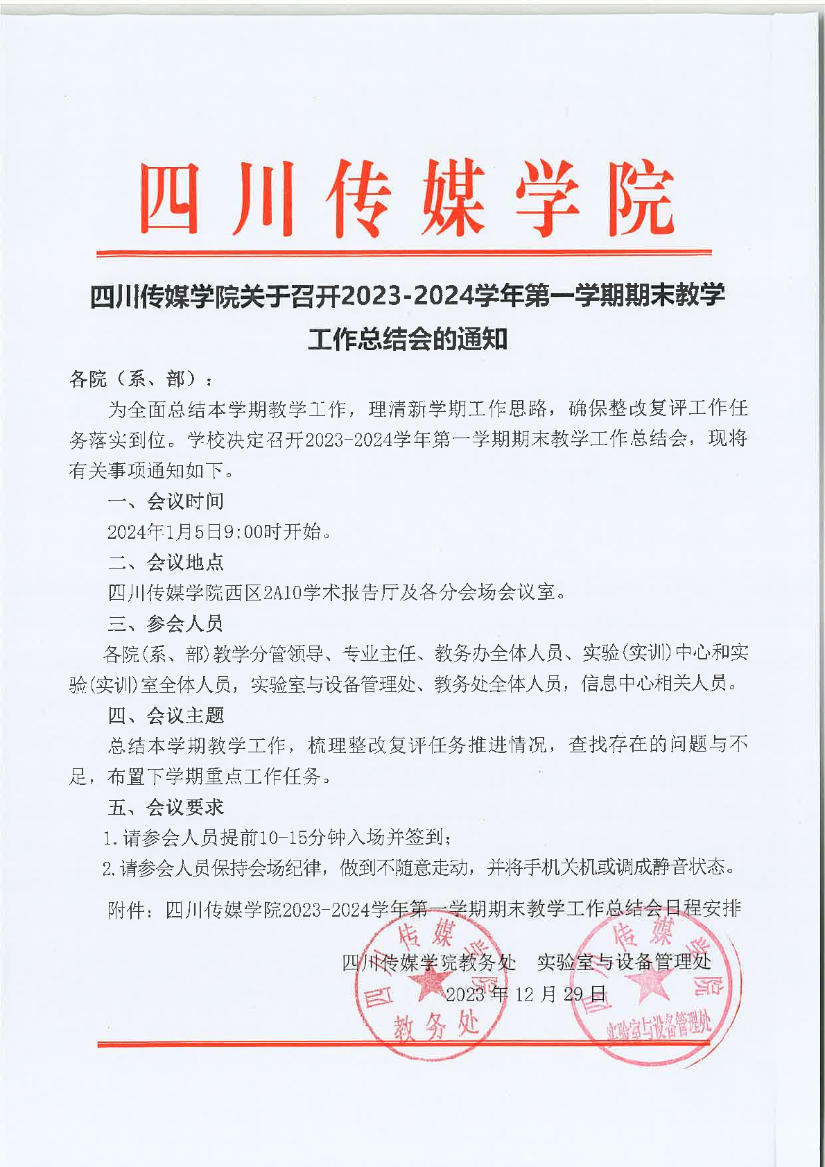 四川传媒学院关于召开2023-2024学年第一学期期末教学工作总结会的通知