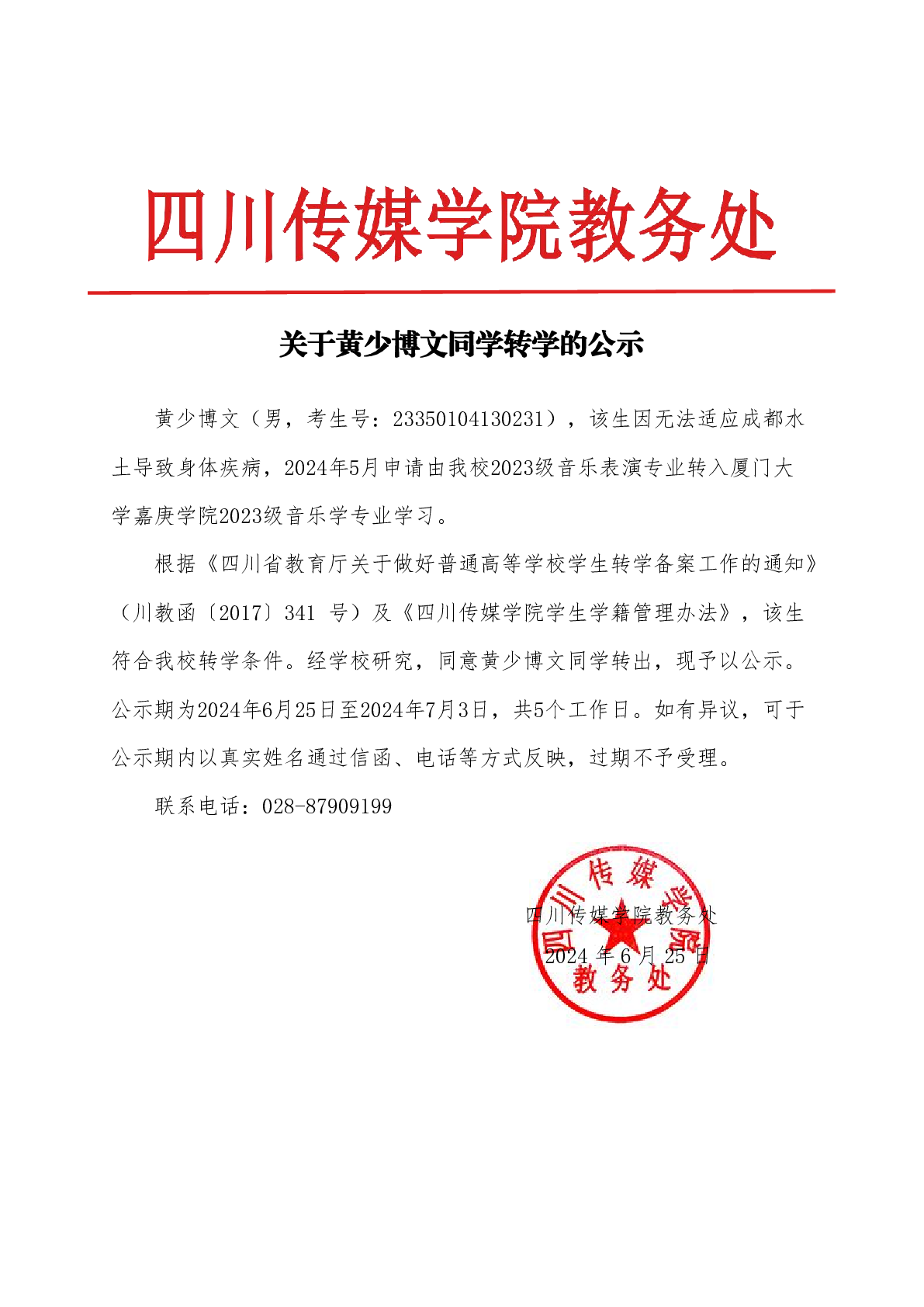 关于黄少博文同学转学的公示