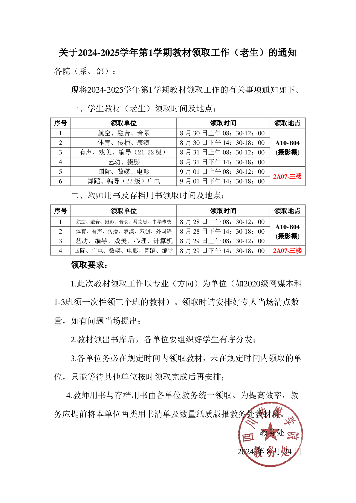 四川传媒学院关于2024-2025学年第1学期教材领取工作(老生)的通知