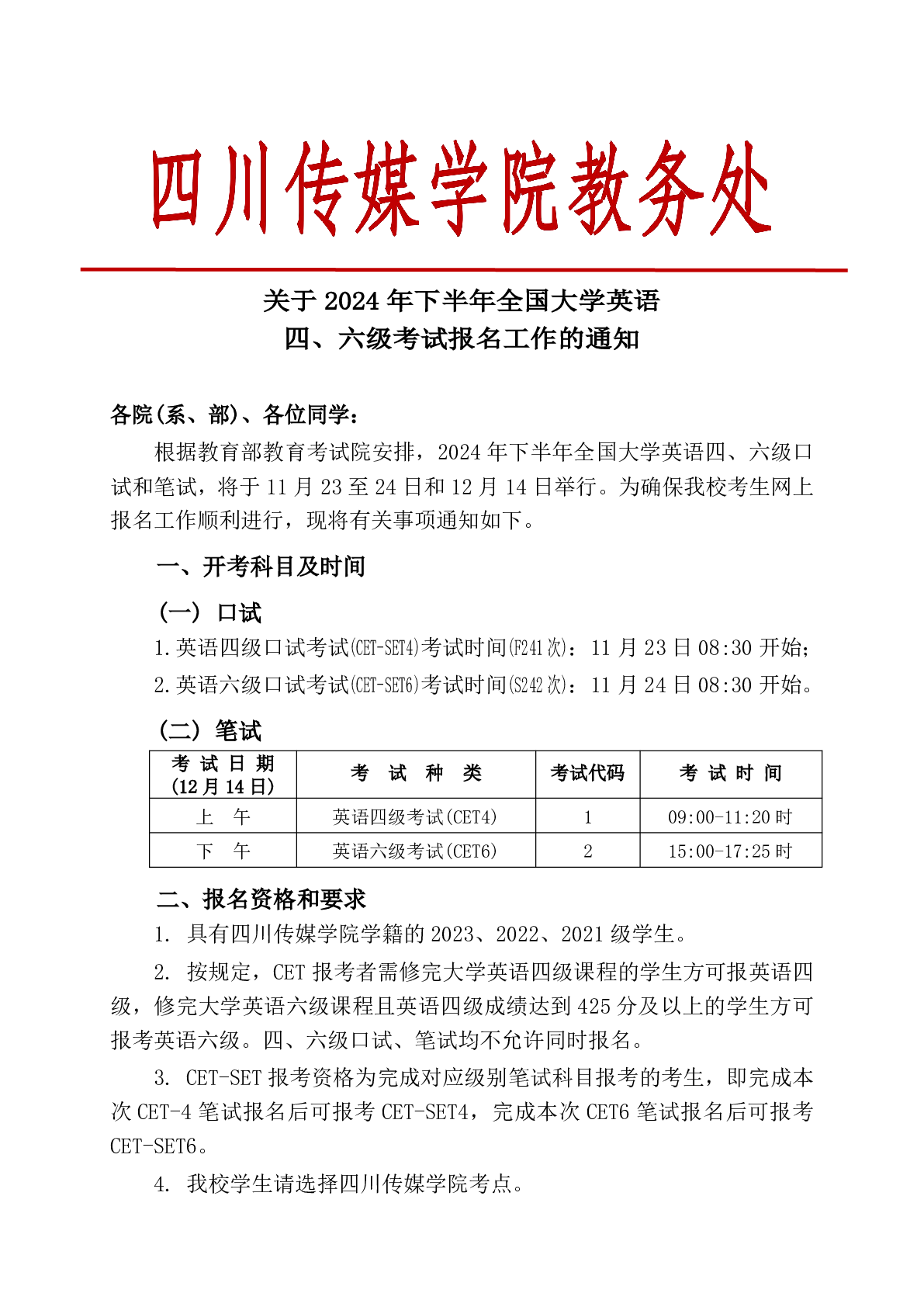 四川传媒学院教务处关于2024年下半年全国大学英语四、六级考试报名工作的通知